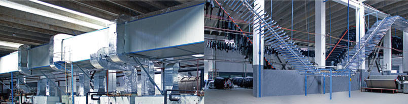 公司新研制開發的通過式低溫皮革干燥系統包含皮革懸掛鏈系統,皮革干燥通道和干燥調溫空調機組。低溫皮革干燥系統將皮革干燥通道分為若干個區域進行溫度和濕度的獨立控制,為皮革提供了一個均勻的、穩定的、漸進的干燥環境。低溫皮革干燥系統可限度地減少皮革干燥過程中的收縮并較高干燥效率。